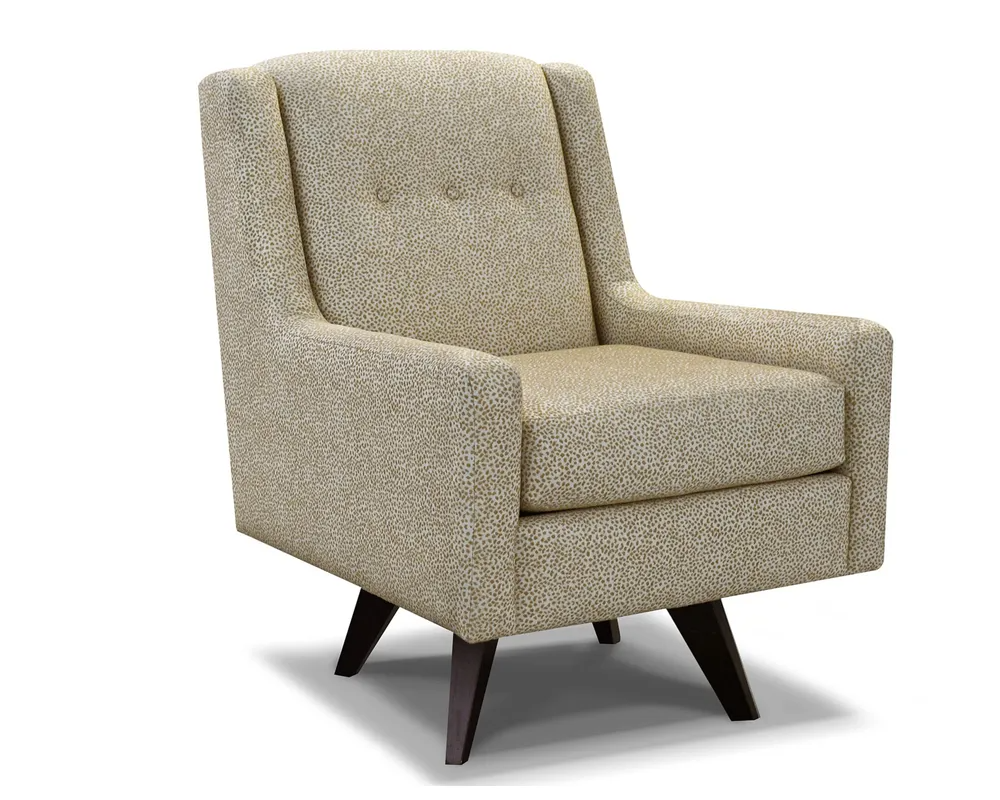 Our Ezra chair adds a pop of mid-century flair to any room! Sitting atop a wooden swivel base, the chair boasts a single row of buttons across the back and a sleek non-welted silhouette. Cover it in your choice of fabric to make it work in your home.Read More