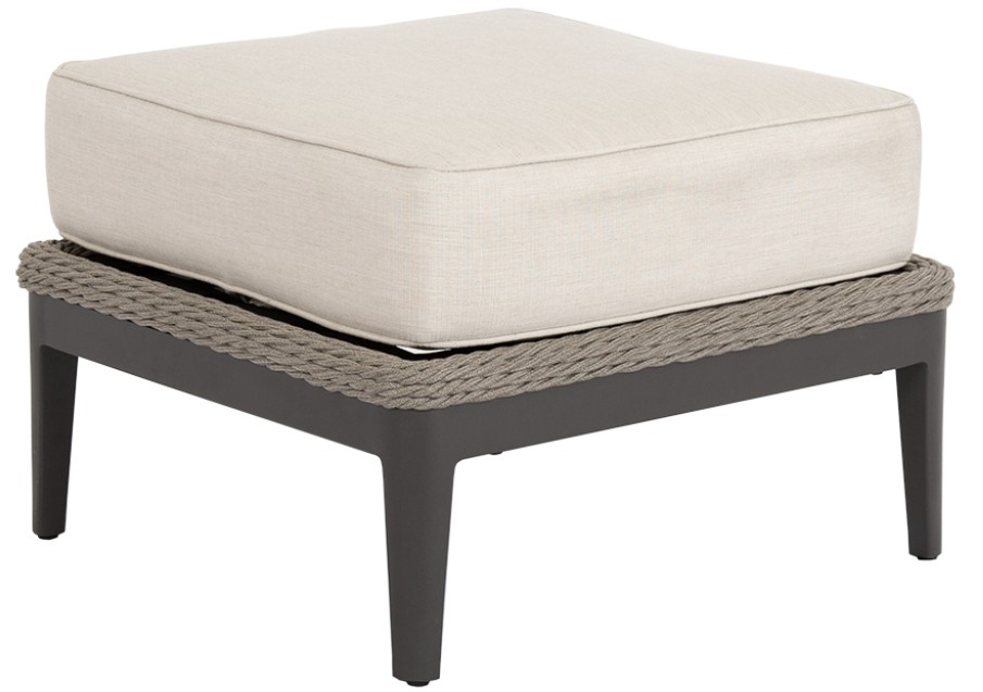 The Marbella Ottoman features a braided rope design, a plush 6" box cushion, and tapered legs crafted from powder-coated aluminum, blending durability with contemporary style for both indoor and outdoor lounging spaces.Read More