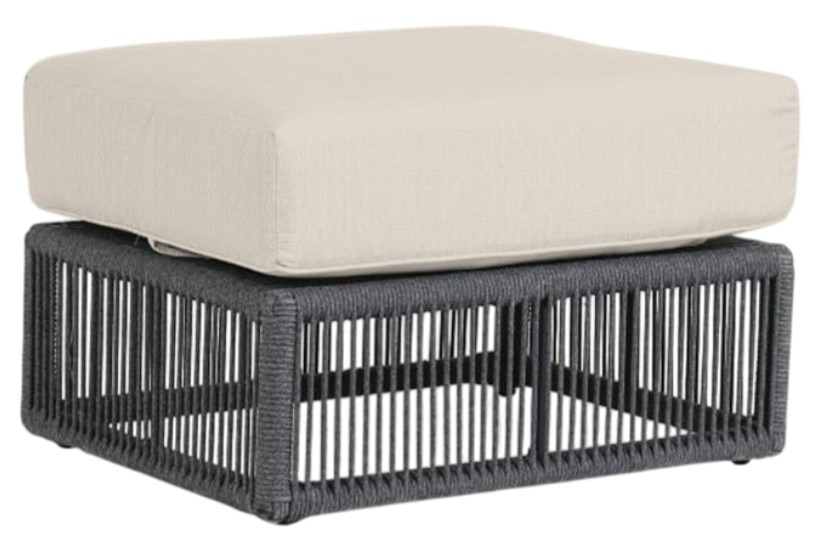 The Milano Ottoman is rendered with a box aluminum frame, expertly hand-wrapped by artisans with premium all-weather olefin rope in a charcoal-grey. Stocked with a plush 6" cushion for supreme comfort.Read More