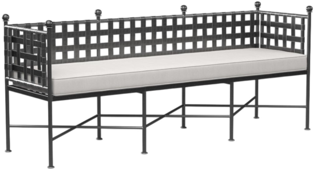 Constructed in expertly crafted wrought iron, the Provence bench displays a woven basket weave frame, and subtly brushed century pewter antique finish topped with well-dressed finials. Featuring a 72" bench seat cushion, this piece is excellent for garden lounging, or paired with the Provence Dining Table.Read More